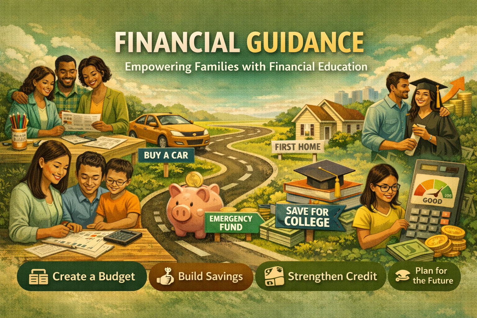 After mastering the foundational skills, families are eligible to participate in advanced financial education courses that focus on major life goals. These courses are designed to be practical, accessible, and relevant to real-world decisions families will face.