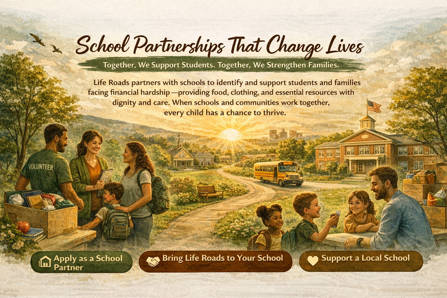 Life Roads partners with schools to identify and support students and families facing financial hardship—providing food, clothing, and essential resources with dignity and care.